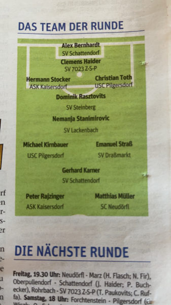 Dies klingt zwar etwas vermessen bei diesem Resultat und der Gegner war uns in vielen Belangen weit überlegen, aber einige interne Vorhaben funktionierten ganz gut, so wie zB dass wir jede Halbzeit unterschiedliche Schwerpunkte setzten und die zweite Halbzeit, trotz einiger Wechsel, mit nur 1:3 verloren. Dies war auch bereits vor Beginn des Spieles unser Vorhaben, dass wir beide Halbzeiten separat bewerten werden. Erwähnenswert war auch unser Ehrentreffer, welchen Gerhard Karner, mit einem sehenswerten Schuss erzielte.