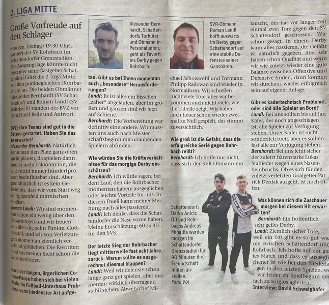 Nach dem knappen, aber nach Betrachtung des Spieles auf Video, verdienten Heimerfolg gegen Neudörfl geht es in die Derbywoche. Am Samstag treffen wir in Rohrbach auf den Tabellenzweiten und freuen uns auf ein Schlagerspiel gegen unsere Partner aus der Spielgemeinschaft "Juniors"