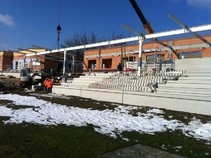Trotz der schlechten Witterung wird auf der Sportanlage fleißig gearbeitet. Der Umbau des Altbestandes ist schon fortgeschritten, sodass mit den Innenarbeiten begonnen wurde. Auch der Neubau ist bereits im Rohbauzustand und sollte bald mit dem Dach versehen werden. Die Fertigteilelemente der Tribüne sollten in den nächsten Tagen geliefert werden.