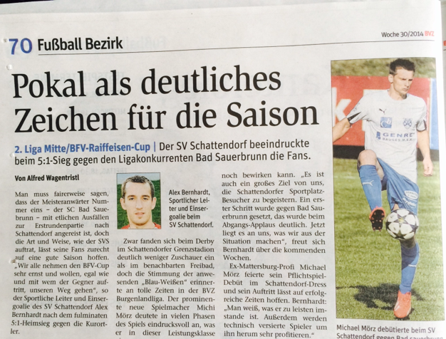 Am Samstag, den 18.07.2014 gehts um 17 Uhr mit dem ersten Bewerbsspiel für den SVS in die neue Saison. In der ersten Runde des BFV Cups treffen wir im Grenzstadion auf SC Bad Sauerbrunn. Laut Medien wird dieses Match als sehr prisant bezeichnet, da womöglich zwei Titelkandidaten aufeinander treffen.