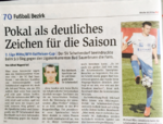Trotz einer sehr guten Leistung sind wir aus dem BFV-Cup ausgeschieden. Wir konnten zu Hause nach 90 Minuten wieder nicht besiegt werden (seit 28.5.2014) und mussten uns erst nach Elfmeterschießen geschlagen geben.