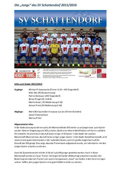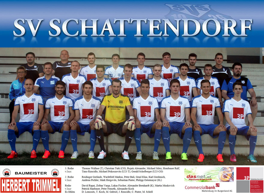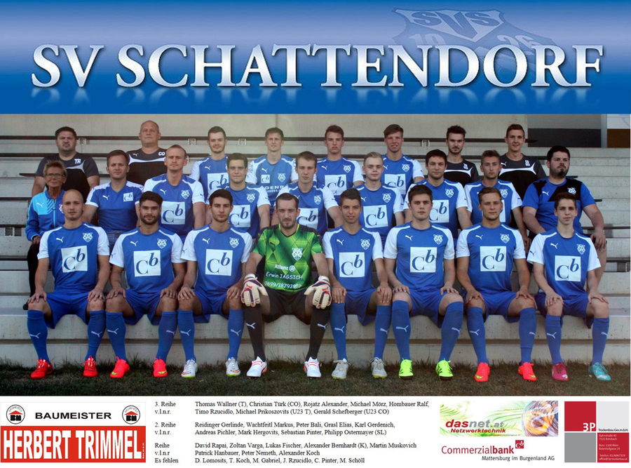 Trotz des Fehlens einiger "Stammkfräfte" (siehe Bildbeschreibung) wurde gestern ein erstes Teamfoto des Kaders des SV Schattendorf erstellt. Die "Jungs der Reservemannschaft" bzw. ein vollständiges Teamfoto wird zu Beginn der Meisterschaft veröffentlicht.