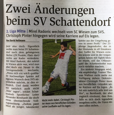 Wie schon vorige Woche berichtet, ist der SVS nicht aktiv auf der Suche nach Neuerewrbungen. Trotzdem kann sich der SV Schattendorf auf einen Neuzugang im Frühjahr 2016 freuen. Der Siegendorfer Mirel Radonic, welcher in Wiesen und davor in Sigless spielte, wird auf eigenen Wunsch zum SV Schattendorf wechseln. "Mirel passt genau in unser Profil mit jungen talentierten Spielern aus der Umgebung und wenn solch ein qualitativ guter Spieler auf eigenen Wunsch sich dem SVS anschließen möchte, ist dies natürlich sehr erfreulich. Auf jeden Fall ist es ein Transfer für die Zukunft des SVS."