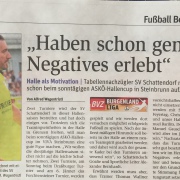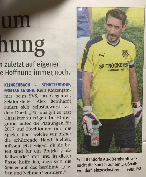 Trotz der herben Enttäuschung vom Wochenende werden wir das Spiel ab morgen abhaken und von Training zu Training schauen, damit wir mit Mut nach Eberau am Sonntag fahren. Und eines kann ich versprechen, auch wenn "NICHTS" derzeit für uns (auch zu recht) spricht, werden wir auf keinen Fall schon von irgendwelchen Szenarien im Sommer 2017 sprechen, denn es gilt jetzt mal die Tabelle und die schlechten Ergebnisse auszublenden und einfach Tag für Tag an uns zu arbeiten und uns mit kleinen Schritten weiter zu entwickeln.