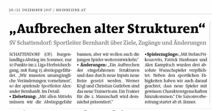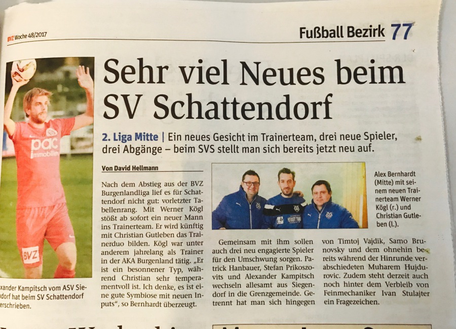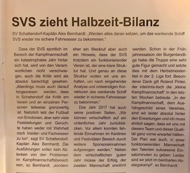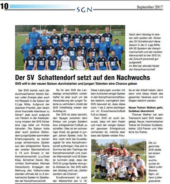 In den neuen Schattendorfer Gemeindenachrichten gibt es auch einen Bericht über den SVS, welcher zwar schon vor einigen Wochen geschrieben wurde, allerdings inhaltlich, trotz des nicht geplanten schwierigen Saisonstarts, nach wie vor die Lage des SVS sehr gut beschreibt (siehe Bild 1 unten).